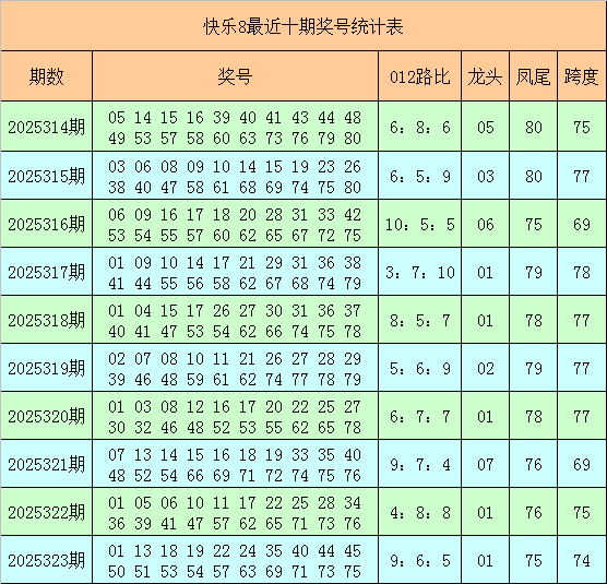 雀跃8第2025323期奖号为:01 13 18 19 22 24 35 40 44 45 50 51 53 54 57 63 69 71 73 75,其中奖号012路比为9:6:5,0路号码(9个):18、24、45、51、54、57、63、69、75,1路号码(6个):01、13、19、22、40、73,2路号码(5个):35、44、50、53、71。