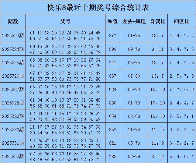 福彩平静8第2025332期开奖回来:02 05 06 08 10 16 26 27 35 40 48 49 54 56 57 58 61 72 73 79,其中奖号和值为782,跨度为77,奇偶比开出8:12,012路比开出6:8:6,四区比开出6:4:6:4。